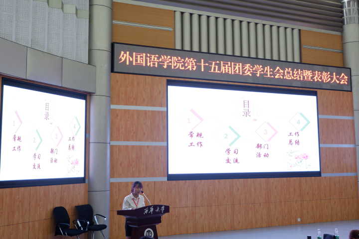 此次大会标志着外国语学院第十五届团委学生会的工作已经落下帷幕,我院团委学生会也将迎来新一届的成员。通过此次大会,团委学生会对这一年的工作进行了总结,发现了学生会在工作中的优点和不足,同时提出了改进方案。并且向我们展示了我院第十五届团委学生会不断成长的过程,为下一届的学生会打下了坚实的基础。