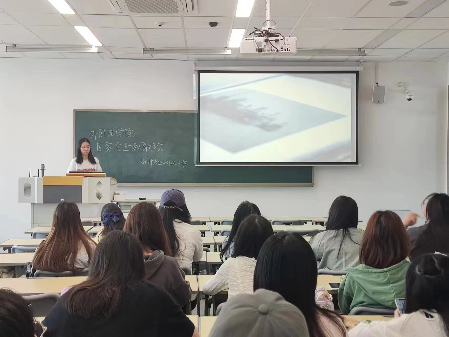为了培养全体学生的国家安全观意识,提升学生们的政治素养和家国情怀,促进学生们的全面发展。2023年4月23日下午5:50外国语学院在4A301教室召开了关于“国家安全教育”的课堂教学,由辅导员杨磊老师主持。