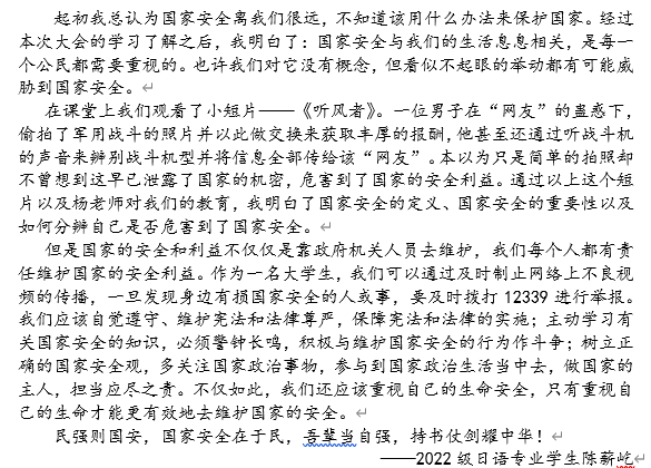 国家安全与每个人的生活息息相关。作为新时代的大学生,我们更要承担起应有的责任,时刻保持警惕,时刻关注国家的安全和发展,维护国家安全,共同促进社会的和谐发展。