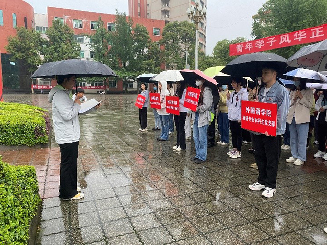 为推进学校学习贯彻习近平新时代中国特色社会主义思想主题教育走深走实,激发广大学生党员把思想和行动统一到党的二十大精神上来,统一到推动实现学校第二次党代会和“十四五”发展目标上来,增强主题教育的感染力和吸引力,外国语学院于5月22日上午7点在郫都校区明德广场举行“国旗下的誓言”升旗主题活动,学院全体学生党员参加。