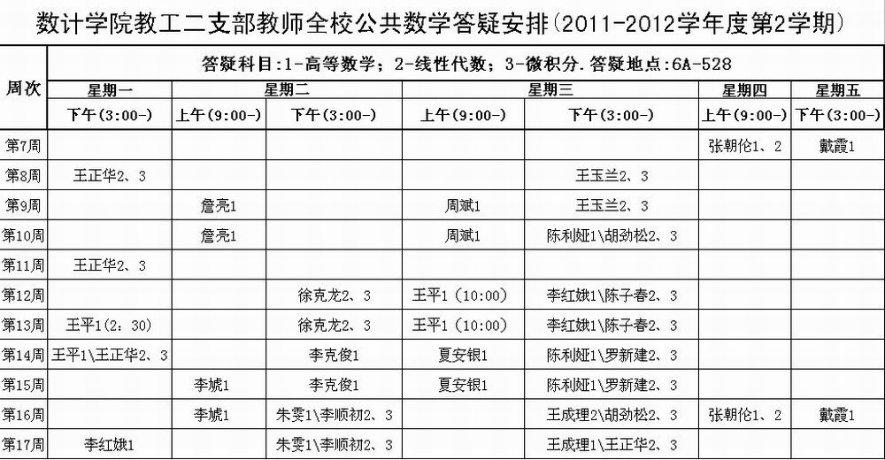 数学与计算机学院教工第二党支部响应学校和学院党委号召,认真开展创先争优基层组织建设年工作,决定从本学期第七周开始,面向全校进行公共数学答疑活动,答疑科目为高等数学、线性代数和微积分,答疑地点设在6A-528。 3月22日,学院教工第二党支部召开民主生活会。会上,支委与全体党员围绕本支部的班子建设、党员队伍发展、工作机制建立以及作用发挥等情况进行了深入分析和讨论,大家畅所欲言。 为了深入开展创先争优活动,根据应用数学系的专业特点,结合西华大学开展“高等数学质量年”活动,三位支委与全体党员共同协商,决定在全校开展公共数学答疑活动,在固定时间和地点为学生答疑解惑,为整体提升我校学生数学成绩、为学生考研做出努力,并认真制订了答疑计划。无党派人士、应用数学系主任张朝伦老师表示也将积极参与全校公共数学答疑活动。 据悉,该支部全体党员表示,一定要将全校性公共数学答疑活动持续开展下去。