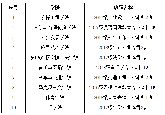 机械工程学院2017级工业设计专业本科2班重视班内同学专业素质培养,鼓励学生参与科技创新活动,共计获奖18人次,国家级2人次,省级10人次,校级奖项6人次,发明专利3人次。文学与新闻传播学院2017级汉语国际教育专业本科2班重视志愿活动建设,暑期三下乡活动、第三届孔子学院大会、央视节目等志愿活动中均可看到他们服务社会、奉献社会的身影。体育学院学院2018级体育表演专业本科1班在刻苦训练中描绘青春画卷,在 “全国啦啦操联赛(成都站)”等十多项国家级、省级和市级赛事中屡创佳绩。理学院2017级化学专业本科3班开展特色班级学风建设,提出“课前十五分钟翻转课堂”、“班Q小花花”的举措,鼓励学生互帮互助,营造积极向学的良好学风。