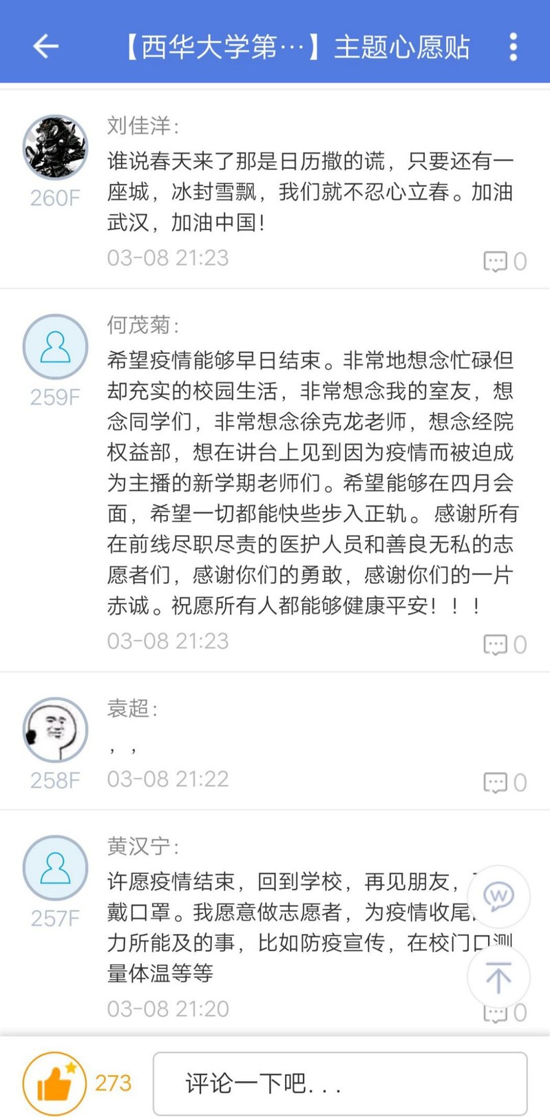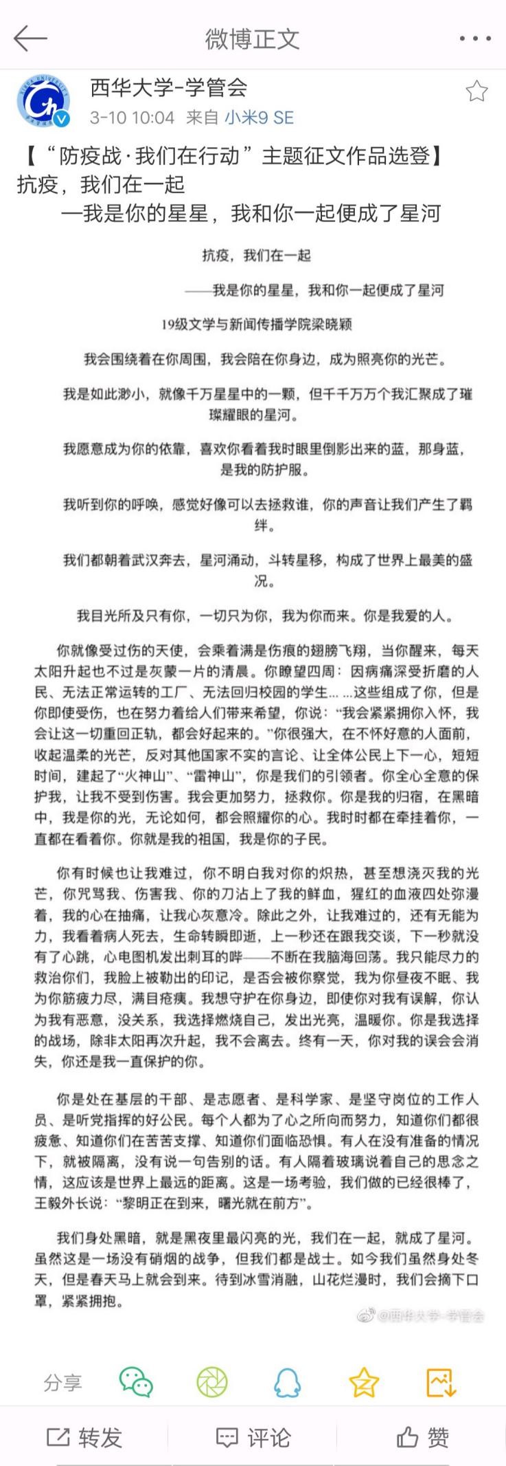 “线上许愿日”活动中,学生通过参与易班“主题许愿帖”进行线上评论留言,“加油武汉、加油中国”“感谢尽职尽责的医护人员和善良无私的志愿者”“致敬所有在一线的工作人员,希望疫情早日结束”……短短时间里,同学们近600条的留言许愿,表达了对医护人员的敬仰感恩和对战胜疫情的信心及对美好未来的期许。在“最美笔记”的分享活动中,学生积极响应“停课不停学”的号召,积极利用慕课和远程学习等方式紧抓学习不放松,疫情期间专心听课,认真做笔记。100余份投稿笔记涉及《游戏理论》《中国法制史》《大学英语》《建筑设计》等不同课程,一份份精美笔记字迹工整,图案精美,排版清晰,展现了西华学子在疫情期间不放松、不懈怠的良好学习面貌。此外,在“防疫战•我们在行动”主题征文活动中,同学们积极投稿,其中《侠之大国,为国为民》《祷告》《抗“疫”我们在一起》等稿件的字里行间中,抒发了学生对抗疫工作人员的敬佩与赞美,和战斗病魔、昂扬向上的青春斗志。