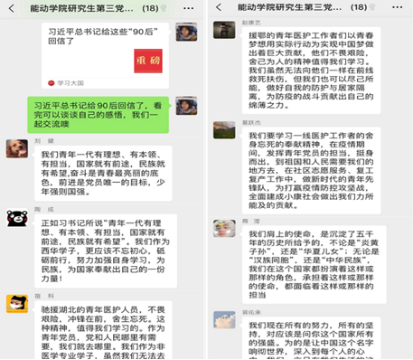 习近平总书记给北京大学援鄂医疗队全体“90后”党员的回信,在学校广大辅导员(班主任)和学生中引起了热烈反响。大家纷纷表示,习近平总书记的回信既是对奋斗在疫情防控各条战线上的广大“90后”青年的关心关怀,又是对投身战“疫”中“90后”青年所做努力的积极肯定,更是体现对新时代、新青年的期盼和勉励。作为新时代的辅导员和青年学生,必须深刻领会习近平总书记回信的重大意义和精神实质,为更好地学习领会回信精神,进一步将回信精神转化为教书育人、努力学习、服务人民的实际行动。学生工作部(处)于3月16日-3月17日,组织各学院、辅导员(班主任)和青年学生代表,通过分散学习、集中讨论、线上交流的方式,进一步学习了习近平总书记给北京大学援鄂医疗队全体“90后”党员的回信内容。辅导员(班主任)和青年学生代表精神振奋、热情高涨地参加了此次活动。