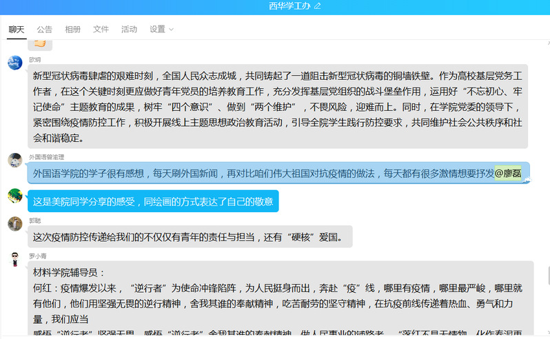 此外各学院也依托网络积极开展主题党日、主题班会活动,同学们通过文字、图画、诗歌等方式纷纷表达对总书记回信的所感、所思、所想。文学与新闻传播学院学生创作了《观回信有感》《习近平总书记回信有感》等五首诗歌,美术与设计学院和土木建筑与环境学院学生创作了《未来》《青春无畏》《新时代、新担当、新作为》《武汉加油》等十余副图画作品,能源与动力工程学院撰写了若干篇心得体会……最后同学们表示,作为新时代的青年大学生,要时刻牢记习近平总书记的殷殷嘱托,不负党的期望,努力学好专业知识,锤炼过硬本领,将小我融入大我,用实际行动展示青春别样的风采。