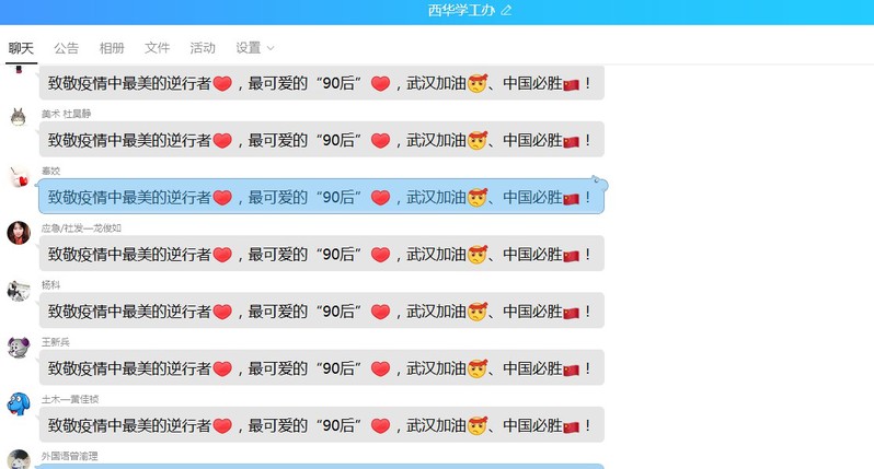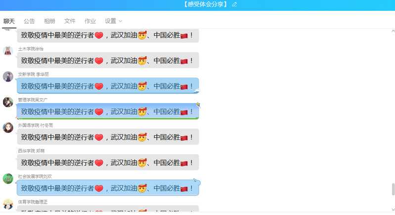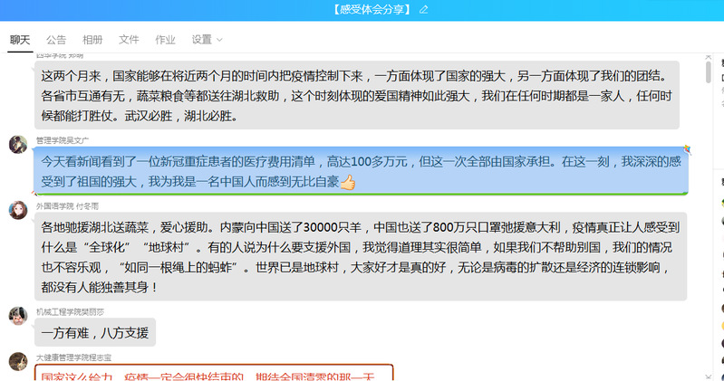 社会发展学院刘欢:在这次抗击疫情的斗争中,以“90后”为代表的青年一代挺身而出、担当奉献,在4.2万多名驰援湖北的医护人员中,就有1.2万多名是“90后”,其中相当一部分还是“95后”甚至“00后”。这让我倍感振奋,我们必将走在时代的最前列,让自己的青春在党和人民最需要的地方绽放绚丽之花。从前我们被你们保护,现在也轮到我们来顶起一片天了!