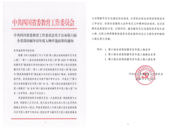近日,中共四川省委教育工作委员会发布《关于公布第六届全省高校辅导员年度人物评选的结果》的通知,我校体育学院辅导员郭聪被评为“第六届全省高校辅导员年度人物”。