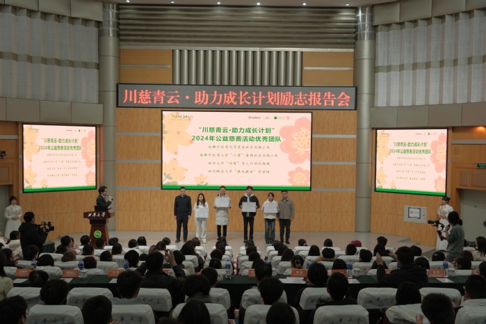 报告会现场,与会领导和嘉宾为优秀的受助学生颁发了“川慈青云·助力成长计划”奋进奖学金,并向2024年公益慈善活动优秀团队颁发了荣誉证书。