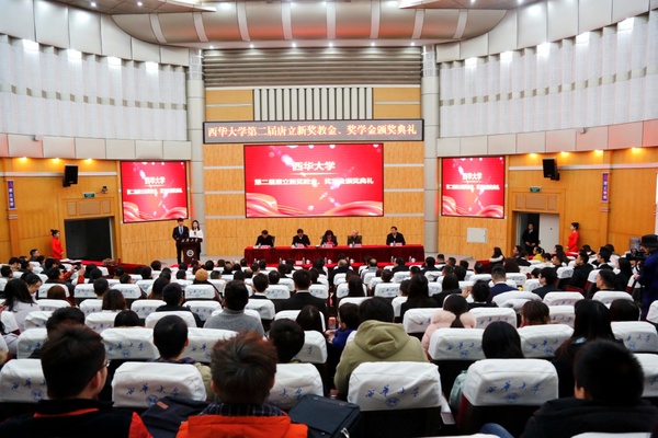 1月8日晚7:00,西华大学第二届“唐立新奖教金、奖学金”颁奖典礼在四教报告厅隆重举行。新尚集团董事长兼总裁唐立新,成都新尚创业投资有限公司副总监黎亮,成都创享汇孵化器管理有限公司运营经理唐佳,我校党委书记边慧敏、校长刘清友、校党委副书记王小林、副校长王政书,相关职能部门、学院负责人,获奖师生和各学院师生代表出席颁奖典礼。典礼由校党委副书记王小林主持。