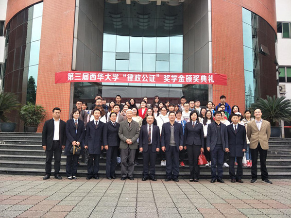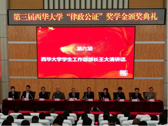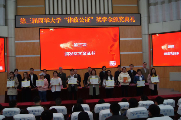 李君宣读了西华大学第三届律政公证奖学金获奖名单,在场领导及嘉宾为40名获奖学生颁发了获奖证书。
