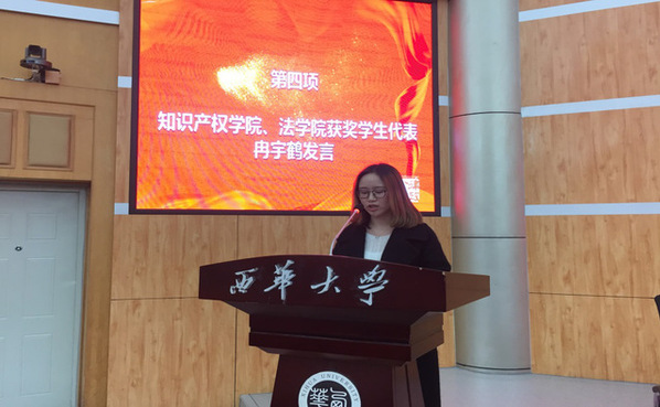 知识产权学院、法学院学生冉宇鹤代表获奖同学向成都市律政公证处、学校、学院各级领导老师的关心与培养表示衷心的感谢。她说:“律政公证奖学金是专属于法学专业学生的奖学金,鼓励我们在专业学习和未来从业规划上更加坚定而自豪。我们深深敬佩前辈们‘廉洁、务实、专业、高效’的敬业精神,会不断努力,向前辈们学习,争做不忘初心,脚踏实地,为中国特色社会主义法治建设而奋斗的‘法治青年’。”