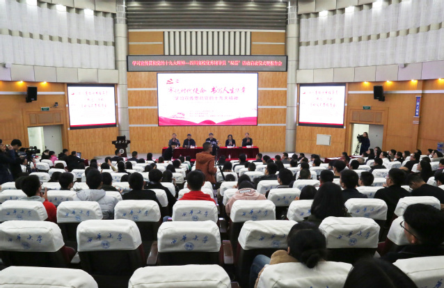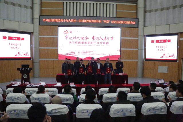 为了响应落实中央、省委、教育部关于推动十九大精神宣传的安排部署,12月19日下午,以“牢记时代使命,书写人生华章”为主题的学习宣传贯彻落实党的十九大精神——四川高校优秀辅导员“校园巡讲”和“网络巡礼”活动首场报告会在我校四教报告厅举行。