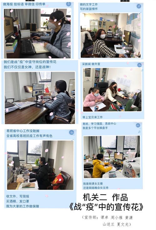 在全国上下共同抗击新型冠状肺炎疫情这个特殊时期,为庆祝“三八”国际劳动妇女节,丰富女职工文化生活,维护女职工身心健康,展现女职工防控疫情、共克时艰的良好精神风貌,营造积极向上的氛围,按照学校党委关于做好疫情期间学校有关工作的部署和校工会的指导意见,机关党委、机关工会采取线上展示反映女职工在抗击疫情期间健康向上的生活状态和工作状态的音像、图文作品的方式,开展以“我为抗疫作贡献”为主题的网络庆祝活动。截止3月7日共征集到美图作品156幅,视频作品6部,作品内容精彩纷呈,全方位反映了机关女职工奋战抗疫第一线的感人事迹,以及学习、健身、养生、摄影、书法、文艺、厨艺、园艺、亲情等各种才艺展示的健康积极、丰富多彩的居家疫期生活状态,充分展现机关巾帼事业家庭两肩挑、使命责任勇担当的风采。8号当天的网络活动现场气氛热烈,机关党委和机关工会通过QQ群、微信群向全体机关女职工致以节日问候,大家在群里相互传递节日祝福与鼓励,欣赏上传到群里的精彩作品,彼此分享工作、学习、生活中的感动与欢乐,作品在闪传直播平台浏览量不到半天时间就超过了3千人次。