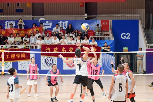 面对强手如林的比赛对手,材料科学与工程学院代表队展现出超强的韧性与毅力。首轮小组赛中,队员们以灵活多变的战术连克五支劲旅取得淘汰赛资格;半决赛对阵上届季军土木学院时,双方比分你追我赶、交替上升,现场气氛紧张激烈。教练闵忠华临场调度,及时调整攻防策略,球队最终以犀利进攻锁定胜局;决赛现场高潮迭起,种子队汽车学院配合默契、行云流水,气势不遑多让。我方队员沉着应对,连续奉献完美配合,一传注意力高度集中,确保传球到位;二传积极跑位,精准调度;主攻灵活多变,打吊结合,连续进攻得分。啦啦队不断为运动员擂鼓助威、鼓掌欢呼,呐喊声响彻全场。随着最后一记扣杀落地,全场爆发出沸腾的欢呼——材料科学与工程学院代表队以全胜战绩登顶夺冠!