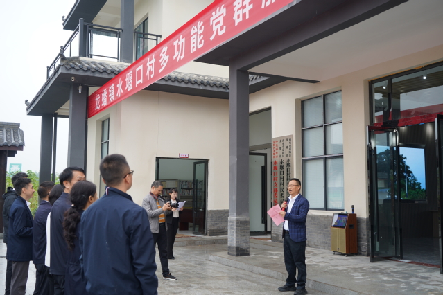 熊江介绍下院山村党群服务中心 随后,李秋实一行参加了水堰口村党群服务中心启动仪式,该党群服务中心由学校捐资50万元,联合顺成纺织品有限公司和嘉陵区人民医院修建完工。启动仪式由龙蟠镇党委委员,副镇长许利霞主持。在驻水堰口村第一书记刁成豆和顺成纺织品有限公司总经理王尚雪的引导下,一行参观了党群服务中心一楼展示大厅,观看了水堰口村驻村工作队宣传视频,了解了顺成公司的发展规划和丝绸产品销售情况。