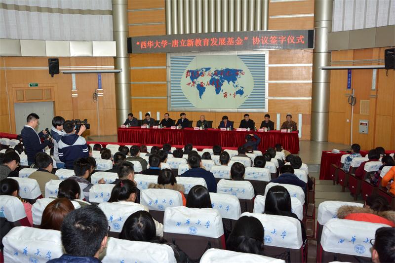 12月18日下午,“西华大学唐立新教育发展基金”捐赠签约仪式在四教报告厅隆重举行。新尚集团创始人、现任新尚集团董事长兼总裁唐立新先生,率唐立新教育基金会包天柱、刘承红等一行专程莅校出席仪式。全体校领导与校内各单位负责人及师生代表共计300余人参加了捐赠仪式。仪式由校党委副书记王小林主持。 仪式上,校党委书记边慧敏首先致辞。边书记代表学校向唐立新先生一行表示热烈的欢迎,并向唐先生慷慨捐资支持学校教育事业的崇高善举表示由衷的感谢和敬意。边书记指出,唐立新先生是一名具有远见卓识而又充满博爱心肠的慈善人士,在事业上取得辉煌业绩的同时,他热心社会公益事业,特别重视支持教育。借由该基金构建的平台,西华学子将能像清华、北大学子一样参加高水平的学科竞赛,这将对拓展师生视野、提升学校影响力产生巨大作用。当前,学校正处在承上启下、启动“十三五”规划蓝图的关键时期,特别需要像唐立新基金这样的宝贵资源加以支持。边书记表示,今天唐立新先生向西华大学的捐赠,是他首次面向省属高校的捐赠,这是他对西华大学的特别关注和重要支持,学校将充分尊重唐先生捐赠意愿,严格按照管理章程,管好用好唐立新教育基金,激励和支持品学兼优的西华学子完成学业、创新创业,调动广大教师在教学、科研及管理等方面的积极性和创造性,促进学校事业发展,希望师生要心怀感恩,以更好的办学成绩回报社会,不辜负唐先生捐赠善举的初衷和期望。 新尚集团董事长唐立新先生随后致辞。他说:“首先感谢边书记、刘校长给我这样一个机会,能让我为西华大学的发展出点力……”他表示,自己一直有一个捐助全国前五名高校及西南前五名高校的心愿,现已实现,西华大学近年来的快速发展促使他下定决心为它做些力所能及的事情。教育发展基金已有7年的历史,实行团队化运营,是一个涵盖留学、创业、教学等多个项目的体系,该基金最大的特点是可持续性,学生可一直申领到完成自己的学业乃至创业;各高校获奖者每年都会开展多种形式的活动进行交流,希望西华师生能尽快融入这个平台,也希望教育发展基金能够在西华生根、开花、结果,让师生的梦想得以实现。他鼓励学子们积极申领该基金,并把学习、互助、优秀、创新、分享当成一种习惯。 在现场嘉宾和师生的见证下,校长刘清友和唐立新先生现场签署了“西华大学唐立新教育发展基金”协议。按照协议,为促进西华大学教育事业的发展,新尚集团董事长兼总经理唐立新先生捐赠人民币1000万元,设立“西华大学唐立新教育发展基金”,用于奖励和支持西华大学学业优秀、品学兼优的学生以及在教学、科研及管理方面有突出贡献的教师。发展基金设奖学金、奖教金、创业基金、文艺基金四大类,共12个项目,设立期限为2016年至2019年。