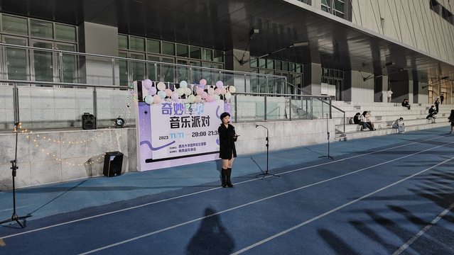 活动开展当日,同学们就被五彩斑斓的气球和灯光吸引了过来。晚风携着同学们的期待,一首《菊花台》作为简单开场,营造了初冬独有氛围,一首《beatbox》激起音乐节的高潮,带动全场对音乐的热情……曲罢,同学们也不忘拿起手中的巴巴掌为演唱者加油打气。现场气氛热火朝天,大家情绪高涨。