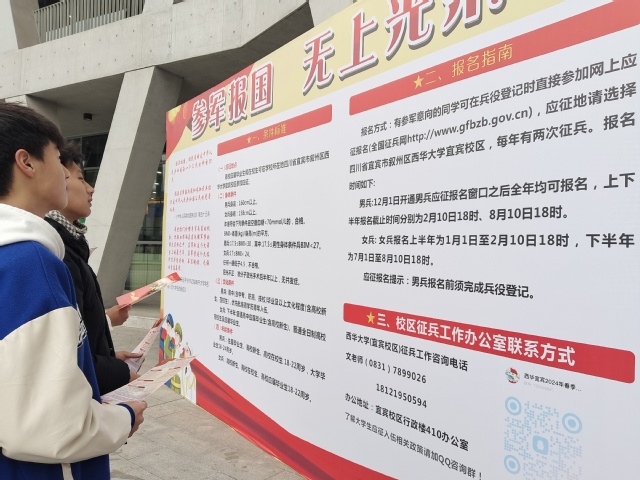 为深入贯彻落实习近平强军思想,激发广大青年学子建功军营、报效国家的热情。近期,宜宾校区多形式开展了2024春季征兵系列宣传活动。此次活动旨在激发广大青年学生的爱国热情,鼓励他们投身国防事业,为实现中华民族伟大复兴的中国梦贡献力量。
