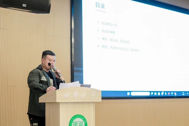 华为终端BG四川终端业务部宜宾和自贡城市总经理文嘉皓,与同学进行了面试技巧的分享。主要从面试类型、面试前准备、单面面试技巧和群面面试技巧四方面进行介绍,总结了同学们在面试时主要遇见的问题并对解决这些问题提供了建设性的意见。文嘉皓说到:同学们应该不断提升自身素质,唯有自身综合能力才能帮助同学们在面试中脱颖而出。