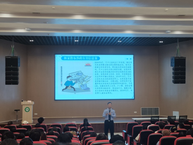 为贯彻总体国家安全观,增强全民国家安全意识,维护国家安全,4月25日下午,宜宾校区在学术报告厅103开展“维护国家安全、筑牢人民防线”讲座。讲座邀请到宜宾市国家安全人民防线宣讲员、筠连县公安局政治安全保卫大队大队长赖智华主讲。