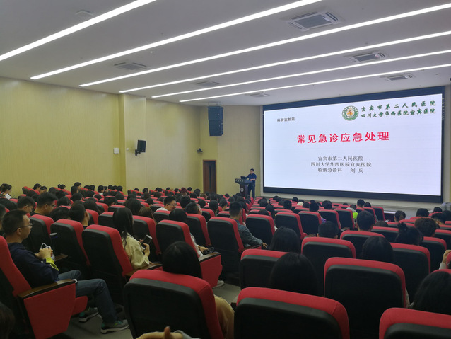 为增强宜宾校区师生的应急救护知识,提高在突发伤病事故现场组织自救互救、科学施救能力,10月12日上午,宜宾校区组织开展“应急救护知识进校园专题培训”活动。培训会邀请了宜宾市人民二医院四川大学华西医院宜宾医院临港急诊科刘兵副主任、杨光平护士长授课。课上结合丰富详实的案例,详细讲解了心脑血管病的急救办法、心肺复苏操作步骤及气道梗阻处理方法、创伤救护和一些疾病的前兆等知识,并现场利用人体模型,操作演示了徒手心肺复苏、气道异物梗阻等紧急救护技术。在场师生认真聆听,并踊跃参与模拟操作。