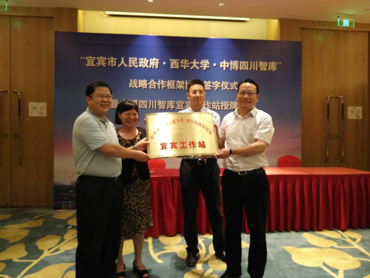 7月29日,“宜宾市人民政府·西华大学·中博四川智库”战略合作框架协议签字仪式暨中博四川智库宜宾工作站授牌仪式举行在宜宾举行。校党委书记边慧敏、副校长王政书出席签字仪式。