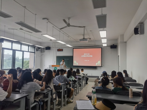 黎老师就就业形势与政策、国家公务员考试、四川省公务员考试、选调生考试部分,围绕招考流程、报考程序、职位表解读、考试科目等九个方面进行重点讲解。老师详细解读了公务员、选调生考试的政策背景和报考条件,为同学们解答了关于考试报名、资格审查等方面的疑问,提醒同学们及时关注各个考试时间节点,同时也强调了制定合理的学习计划和时间管理的重要性,并建议考生在复习过程中注重知识的全面性和深度。除了主讲老师的精彩演讲,现场还设置了互动环节,让现场同学有机会向老师提问、交流心得和经验,并为此还准备了丰富的奖品,以激励同学们积极参与互动。
