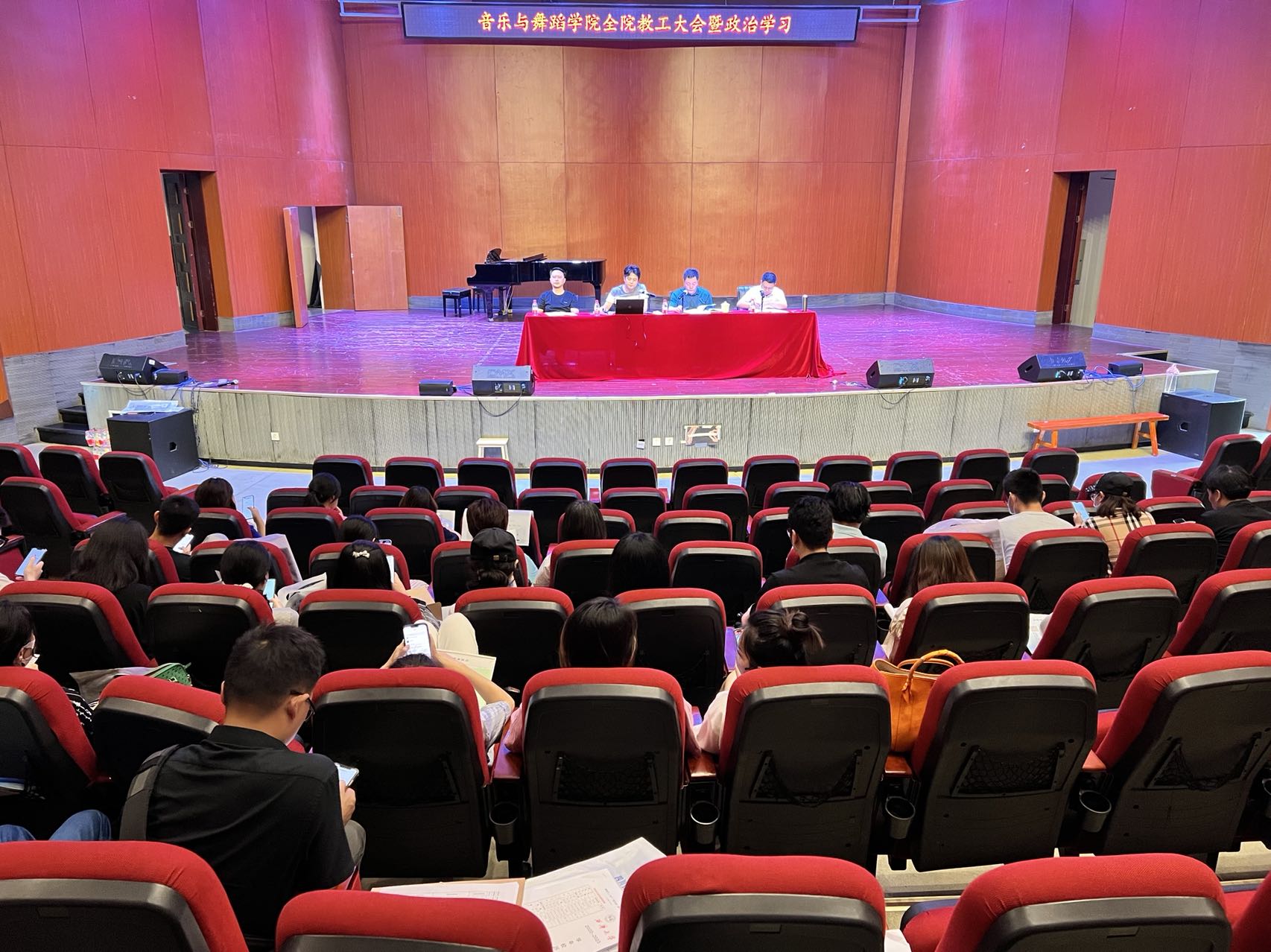 6月9号下午2:00,音乐与舞蹈学院在音乐厅召开全院教职工大会暨集中政治学习,学院全体教职工参会,会议由学院党委副书记、纪委书记李爱军主持。