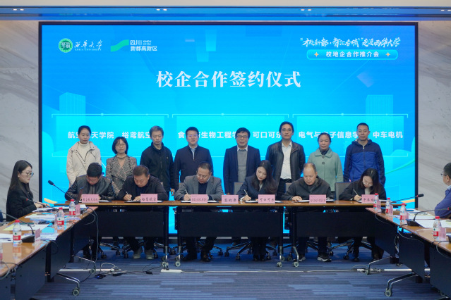 新都现代交通产业功能区党工委副书记、管委会主任张启明详细介绍了功能区建设历史、产业布局、重点企业,希望以此次活动为契机,进一步整合校内资源与社会资源,聚焦人才联合培养、企业科研攻关、学校成果转化,充分发挥高校的专业、人才和园区的政策、产业集聚等综合优势,不断开拓校地企合作新路径,实现企业、学校、园区三方共赢,共同高质量发展壮大。新都区人才发展中心主任徐士棚宣讲新都区人才政策。随后食品与生物工程学院党委书记熊华,航空航天学院党委书记徐元彬,电气与电子信息学院党委书记周良辉代表学校分别与中粮可口可乐饮料(四川)有限公司,成都裕鸢航空智能制造股份有限公司,成都中车电机有限公司签订人才供需协议,达成合作意向,签约企业代表向学校授予“优质人才培养基地”牌匾。学校党委副书记张力,校党委常委、副校长费凌向中粮可口可乐饮料 (四川) 有限公司,成都中车电机有限公司,成都裕航空智能制造股份有限公司,成都特隆美储能技术有限公司,成都航新航空装备科技有限公司,金杯电工(成都)有限公司,中汽成都配件有限公司,成都精密电机有限公司8家企业授予“实习就业基地”牌匾。最后航空航天学院党委书记徐元彬、成都裕鸢航空智能制造股份有限公司副总经理耿强分别作人才引荐发言。