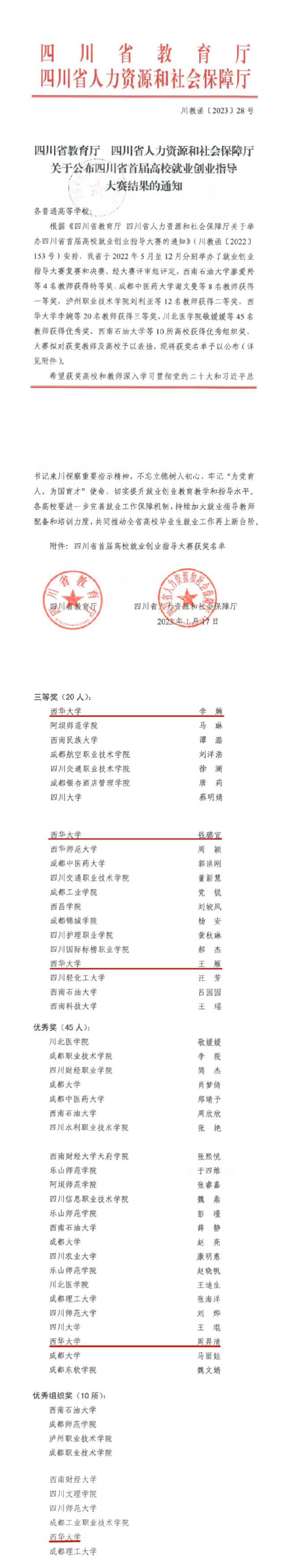 2022年四川省首届高校就业创业指导大赛于近日落下帷幕,经过激烈角逐,我校教师李婉、钱璐宜、王雁以独特新颖的教学方法、深厚渊博的专业知识及生动精确的言语表达荣获省三等奖,周羿清荣获优秀奖,同时学校荣获大赛优秀组织奖。