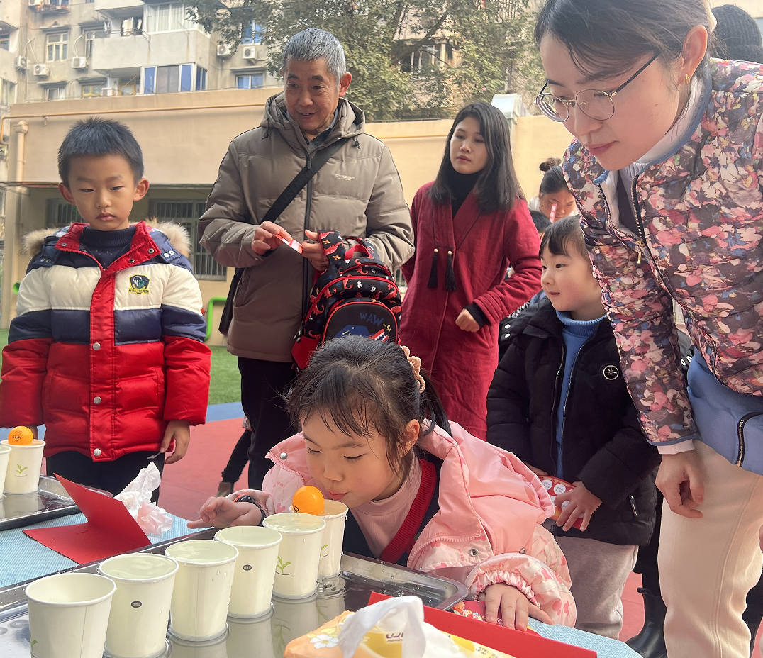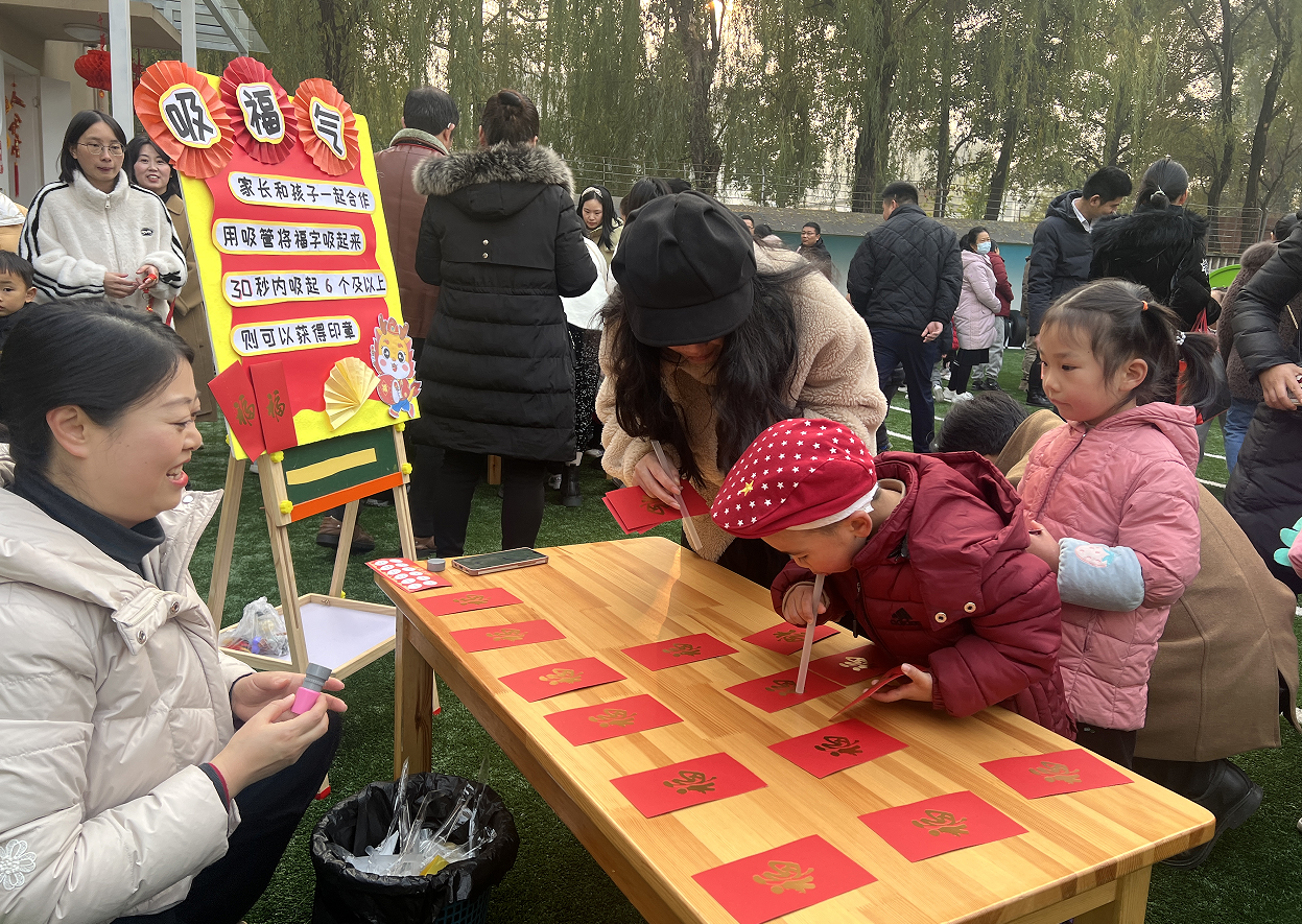此次亲子游园活动以民间游戏为载体,教师们结合幼儿的年龄特点及兴趣,在幼儿园设置了12个不同的游戏点位,有考验智力的拼图和猜谜、有培养合作精神的蒙眼击鼓和吹乒乓球、有锻炼手眼协调的套圈和手工制作等等,每一个游戏都充满着民间游戏的童真与童趣,充满着亲子关系的合作与挑战,蕴含着新年的祝福与期盼。游戏中,每个家庭都兴致勃勃、竞相追逐,家长们和孩子配合默契,尽显亲情的力量和陪伴的幸福,校园里处处荡漾着银铃般快乐的笑声。
