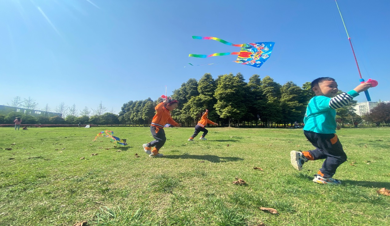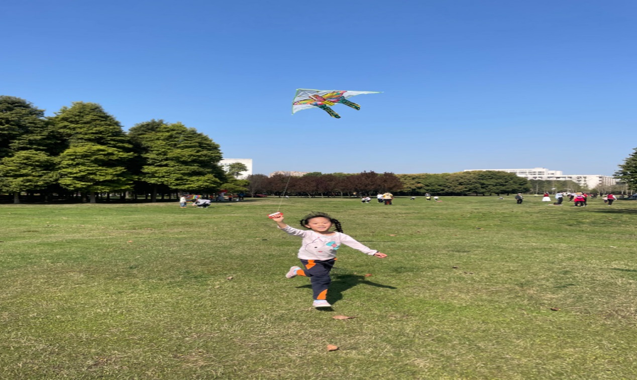 和着香甜的春风,伴着优美的儿歌,一只只承载着梦想的风筝摇曳在湛蓝的天空中,你追我赶,随风翱翔。如茵的草地上,手牵幸福的孩子,跟着风筝奔跑,天空中回荡着阵阵欢声笑语。