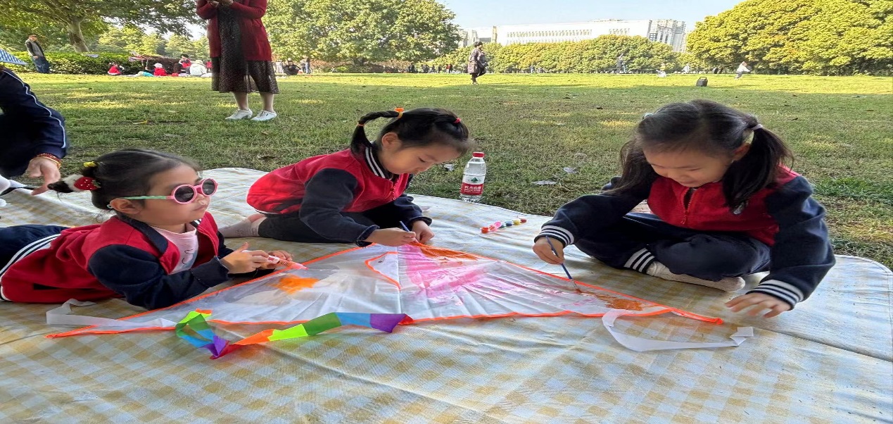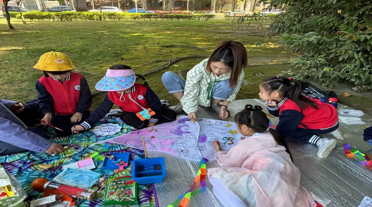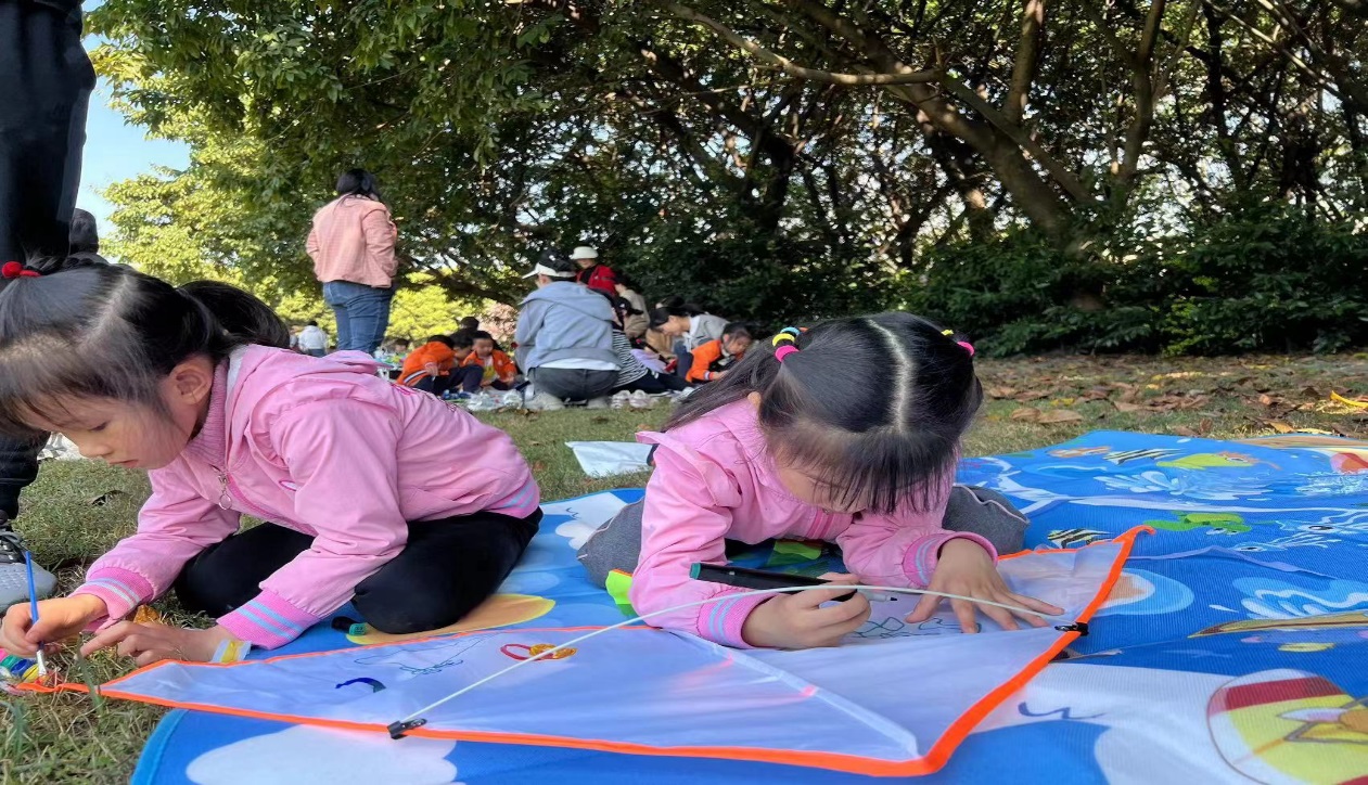 随着老师们的讲解,不待防潮垫铺好,孩子们就迫不及待地在白板风筝上尽情描绘涂色……五彩斑斓的童心世界跃然纸上。爸爸妈妈们既要在旁指点,还得张罗拍照、拾