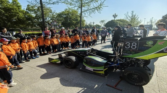 大二班的小朋友们前往学生车队自造赛车集中展示区域,大学生志愿者从家用车与赛车的不同为出发点,讲解了赛车的相关知识,让小朋友们深入了解到赛车的神奇之处。小朋友们用手触摸、感知赛车的奇妙,与车为伴、留下了欢快赛车合影。
