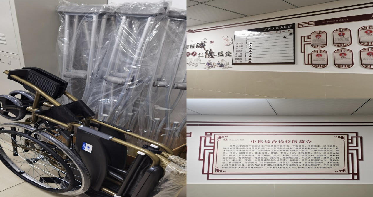给患者准备的轮椅、拐杖和墙面展示