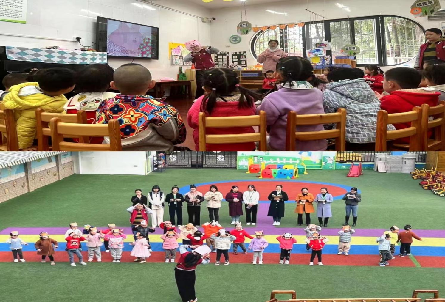老师们观摩了早操活动、入厕、洗手、喝水、集体教学、户外活动、餐前游戏等多个方面的内容。根据幼儿的认知特点和发展规律,小二班贺棋老师设计了语言、艺术领域活动《小猪胖嘟嘟》。通过生动的情景导入,让小朋友们知道如何区别“咕噜噜、呼噜噜”,并且在课堂中小朋友们积极参与小猪的角色扮演,课堂氛围活泼生动。
