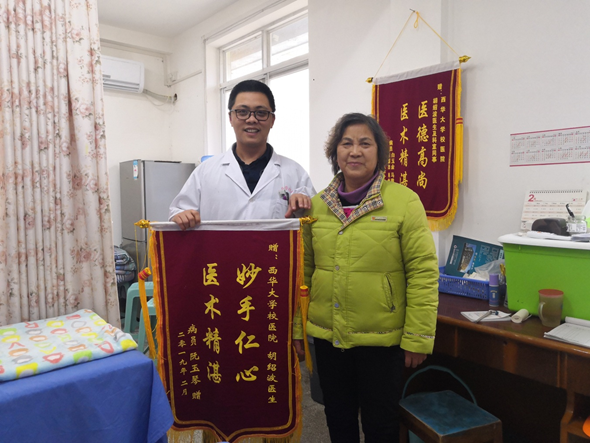 2019年02月27日,患者阮女士为校医院胡绍波医生及其骨伤理疗团队送来的绣着“妙手仁心,医术精湛”的锦旗,表达了对医务人员优质服务和高超医术的高度肯定和赞扬。